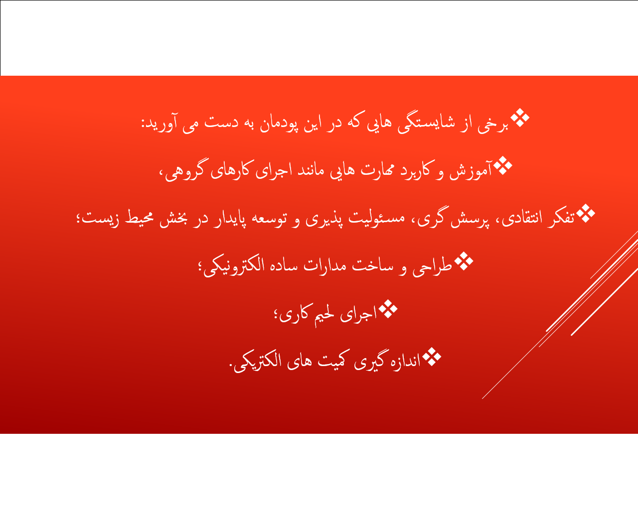 • آموزش و کاربرد مهارت هایی مانند اجرای کارهای گروهی